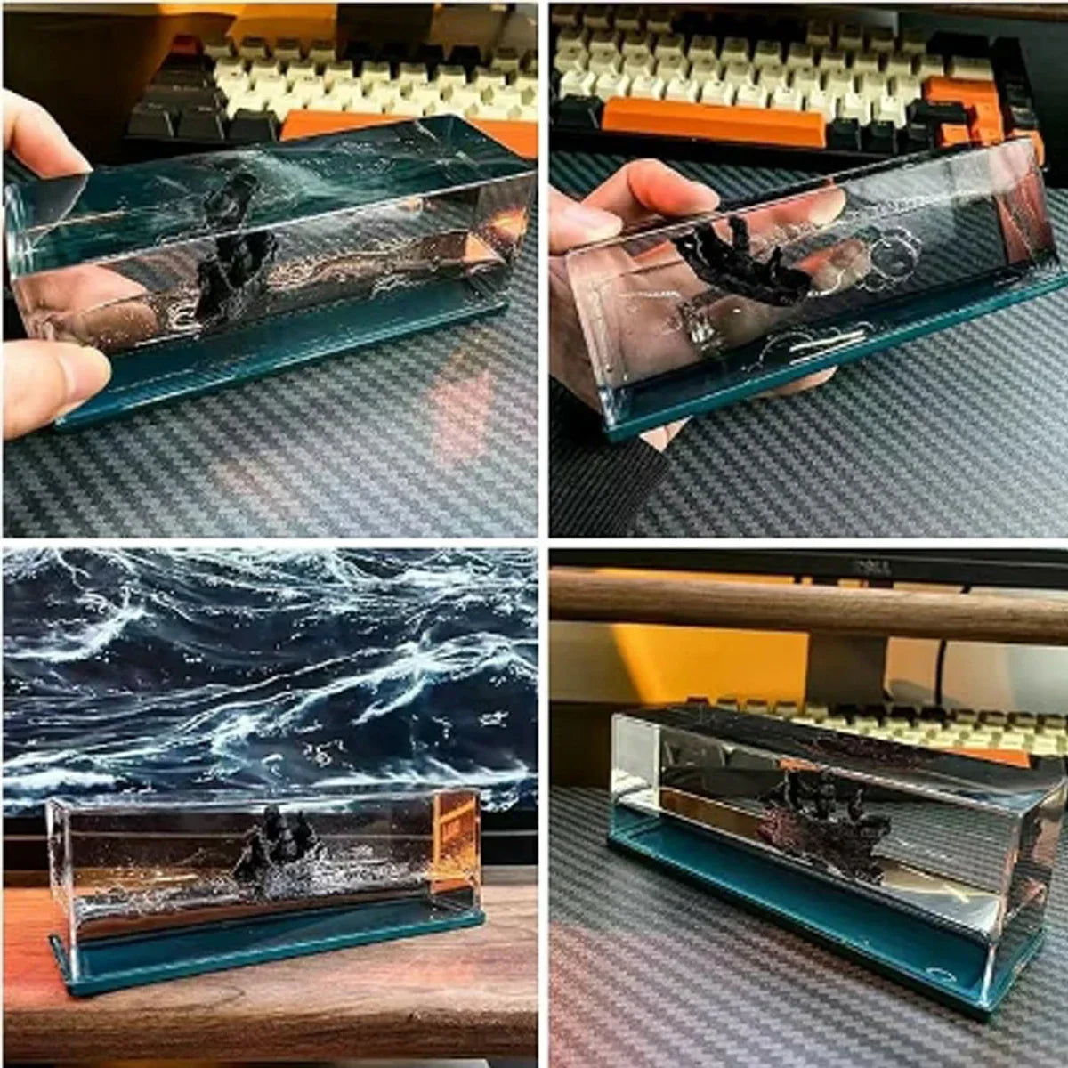 Fabriqué avec une coque extérieure en acrylique résistant et un noyau en résine, le bateau flotte dans un mélange d’eau pure et d’huile végétale — il ne coule jamais !